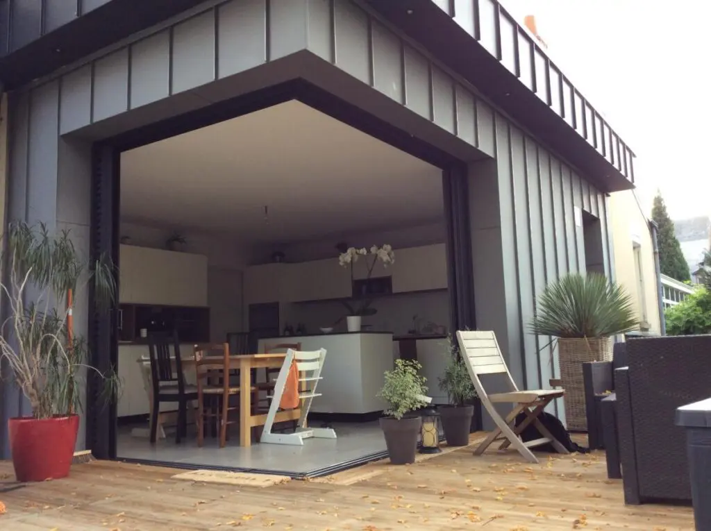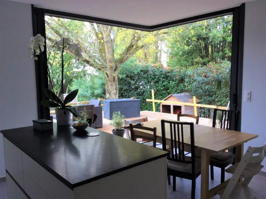 L’extension accueille la cuisine de cette maison, pièce de vie essentielle, elle bénéficie d’une grande baie vitrée donnant un accès direct et facile à la terrasse afin de profiter de l’extérieur depuis l’intérieur. Une fois ouverts, les vitrages disparaissent totalement et la vue sur le jardin n’est pas obstruée.