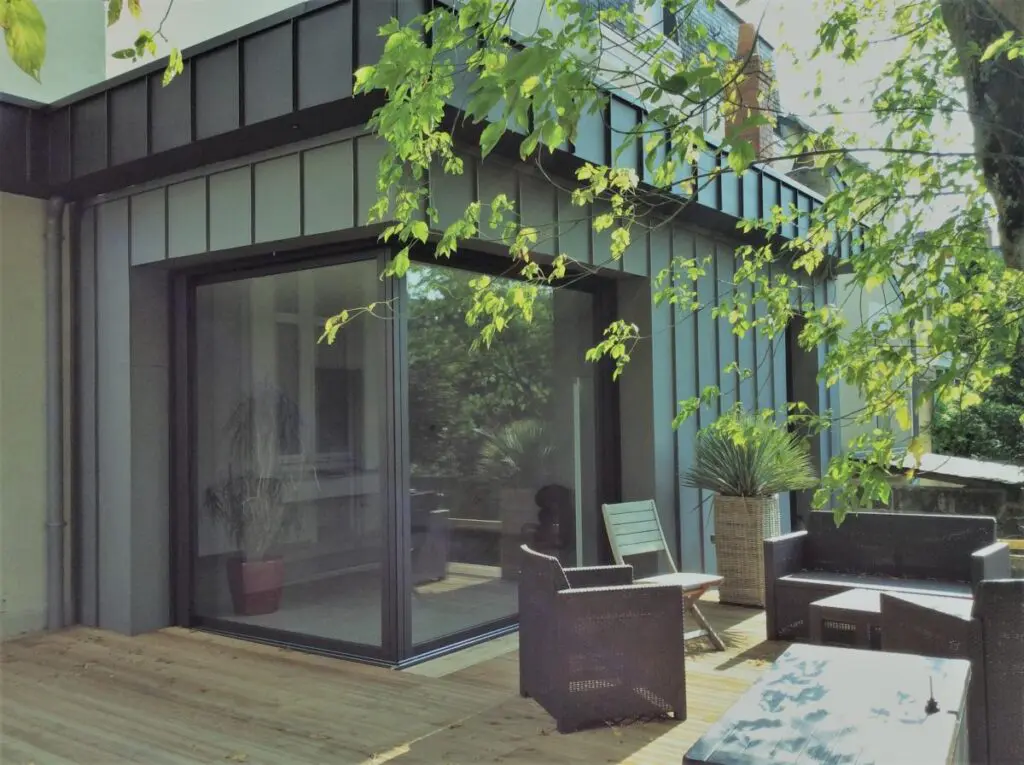 L’extension étant constituée d’une ossature en bois recouverte de zinc, une menuiserie en aluminium a été choisie afin de se fondre dans l’architecture de la maison.