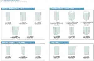 - 17 configurations différentes de paroi de douche et pare-bain : paroi simple ou doubel, fixe ou pivotante, avec ou sans retour…