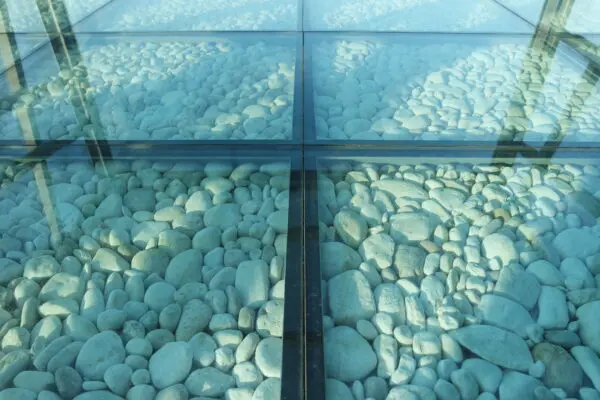 Produit ultra-sécurisé, les dalles de sol en verre sont constituées de plusieurs épaisseurs de verre et de films PVB et une solution anti-glissance peut être également appliquée sur le verre.