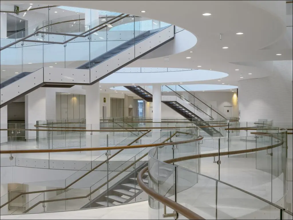 Quesaco ? Il s’agit d’un vitrage pare-flammes, posé en « bord à bord », sans montant intermédiaire, pour avoir ce côté lisse et transparent. Bombées au niveau des puits de lumière pour satisfaire les demandes de l’architecte, en cas d’incendie, ces cloisons en verre bloqueront la propagation des gaz et des fumées chaudes et limiteront le rayonnement thermique (c’est le terme technique pour dire chaleur).