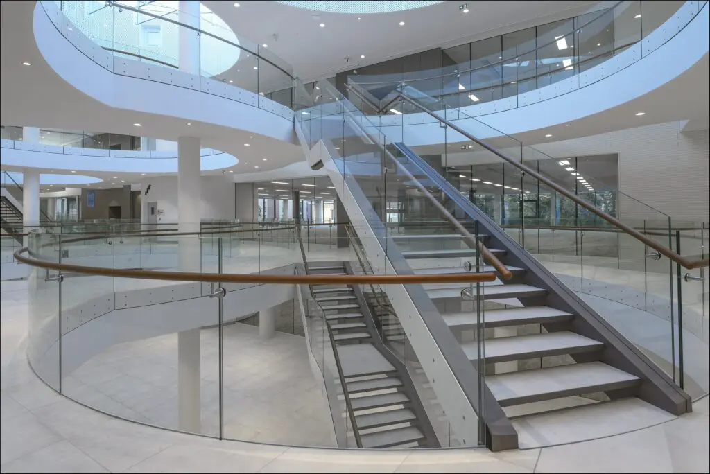 Pour rester dans la lignée d’un bâtiment sûr et transparent, Verre Solutions Rouen a aussi posé près de 900 mètres linéaires de garde-corps bombés tout en verre. Les vitrages sont feuilletés et trempés pour offrir une sécurité optimale. Les profils sont montés en nez-de-dalle (on parle aussi de montage latéral ou à l’anglaise). Ils ne sont pas visibles et donnent cette impression qu’il n’y a pas de structure : transparence maximum, avec un style épuré très contemporain qu’on adore.